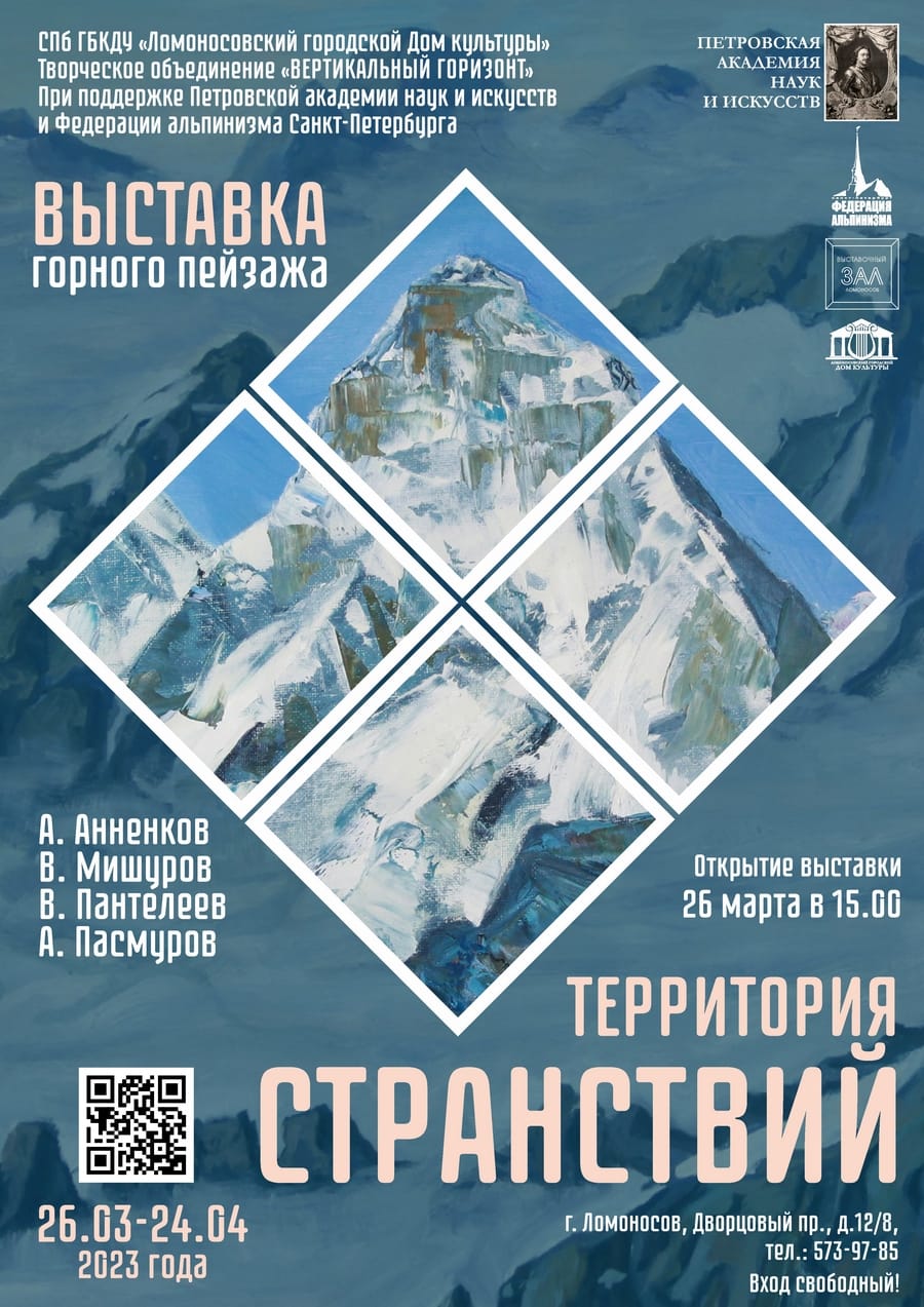 С 26 марта по 24 апреля 2023 года в Доме культуры г. Ломоносов (г. Ломоносов, Дворцовый пр., 12/8) будет проходить выставка горного пейзажа «Территория странствий».